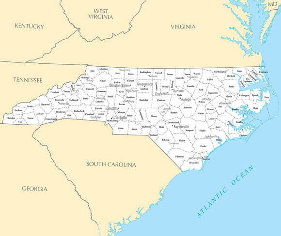 Map of North Carolina NC County Map with selected Cities and